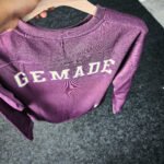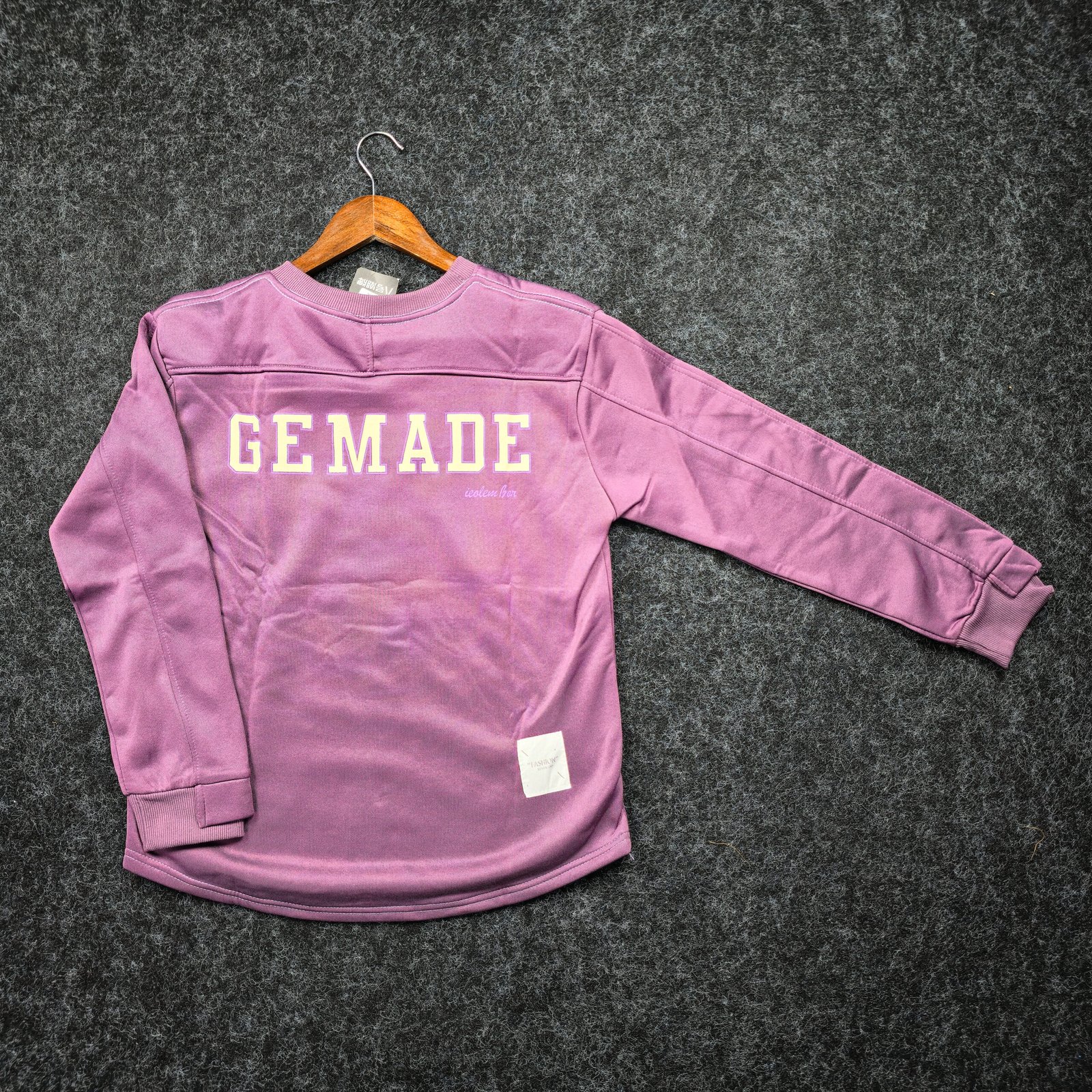 Trendy oversized sweatshirt with bold “GEMADE” varsity embroidery, crafted from ultra-soft fleece in a vintage lavender-grey tone for a cozy, stylish look.