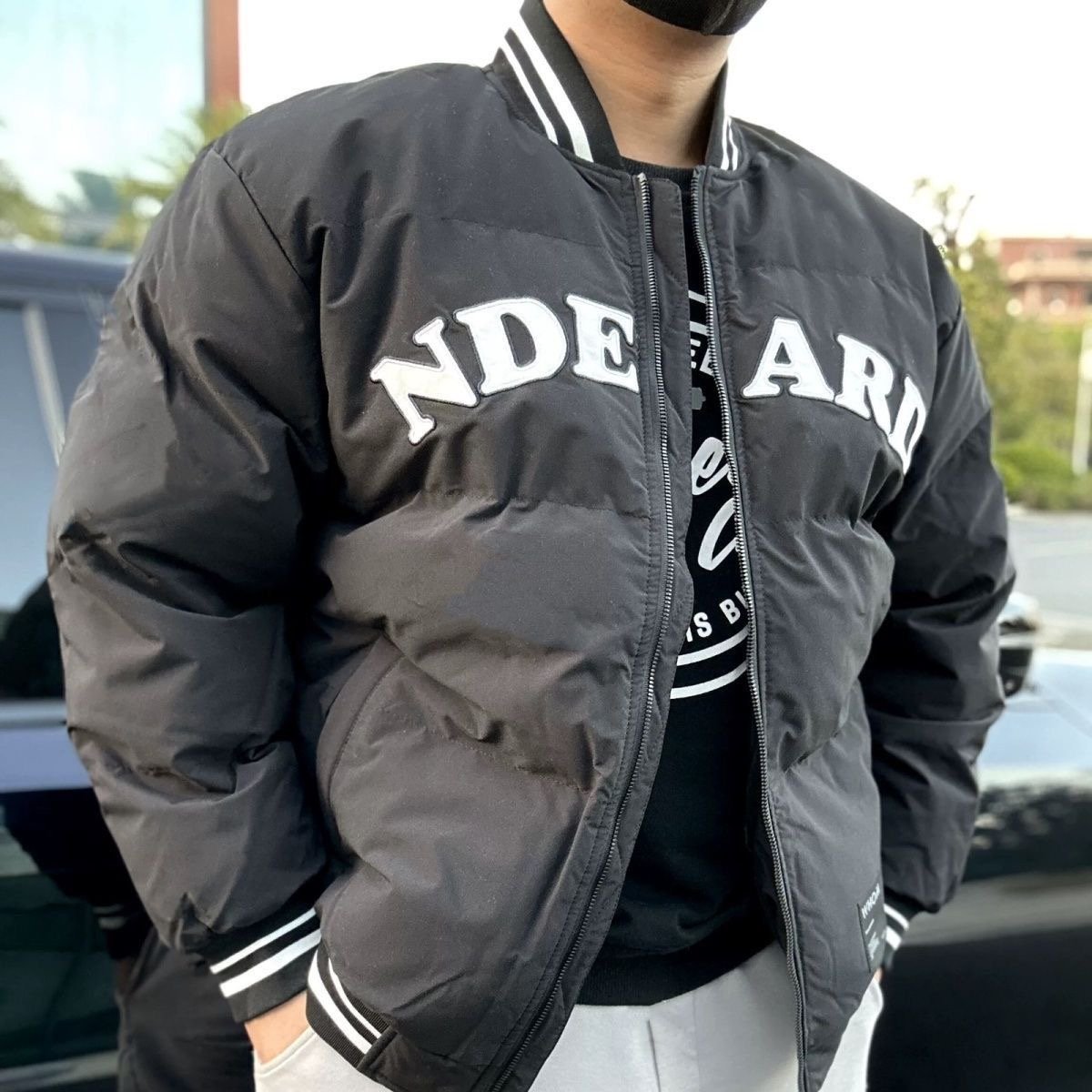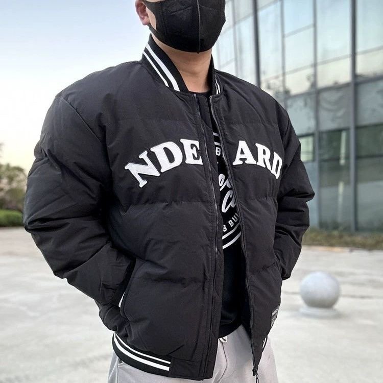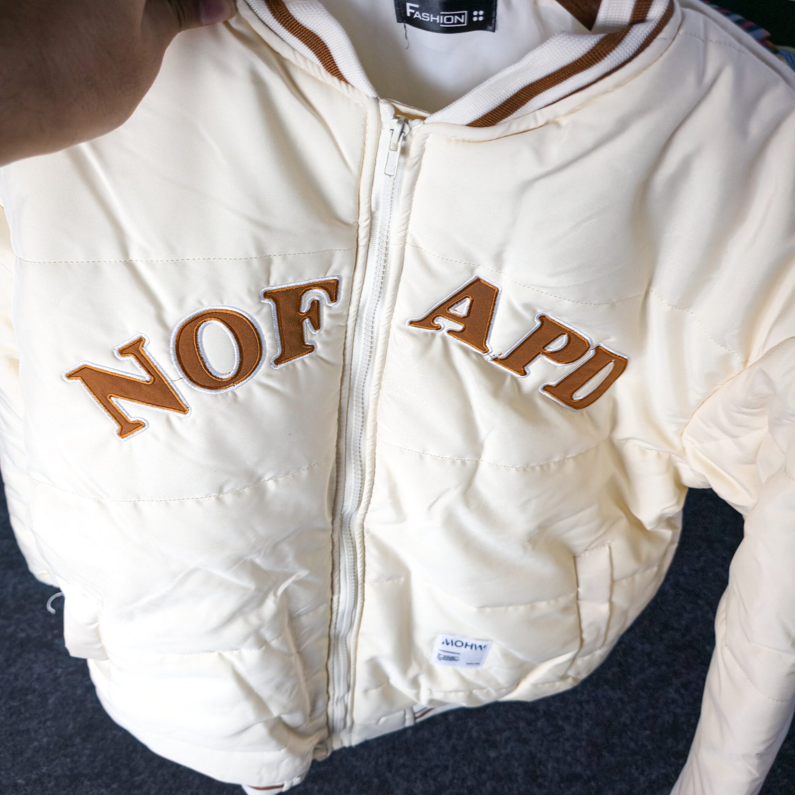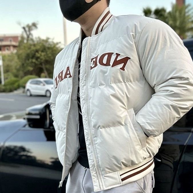 Stay warm in style with this cream-colored varsity puffer jacket featuring bold front lettering, striped cuffs, and a modern athletic fit—perfect for both streetwear and casual winter looks.